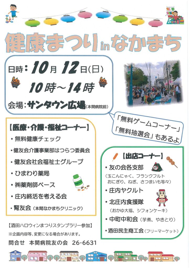 ことしも「どんしゃん さかたハロウィーンまつり」開催いたします!! 10月12日(日)午前10時~午後5時 場所は中町モール・中通り商店街 本間病院友の会主催「健康まつり in なかまち」 は 本間病 …