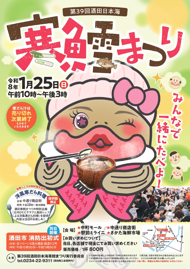 今年も庄内を代表する ”んめもの” 寒鱈のどんがら汁の時期となりました。 中町モール・中通り商店街・駅前ミライニ・さかた海鮮市場・漁師飯番屋を会場に 寒鱈汁・寒鱈フェスタ・酒田のラーメンなどが出店され …